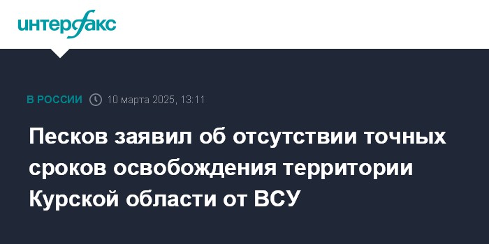 Москва. 10 марта. INTERFAX.RU - Никаких точных дат и сроков полного освобождения Курской области от украинских вооруженных формирований нет, заявил пресс-секретарь президента РФ Дмитрий Песков.