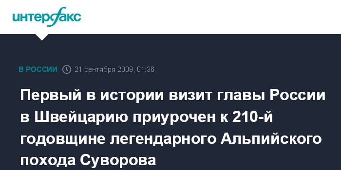 По его словам, визит приурочен к 210-й годовщине легендарного Альпийского похода русской армии под командованием Александра Суворова. У памятника русским воинам вблизи перевала Сен-Готард состоится торжественная церемония с участием глав двух государств.
