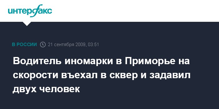 Владивосток. 21 сентября. ИНТЕРФАКС-ДАЛЬНИЙ ВОСТОК - В приморском городе Партизанске водитель иномарки на полном ходу влетел в сквер, где отдыхали люди. Два человека погибли.