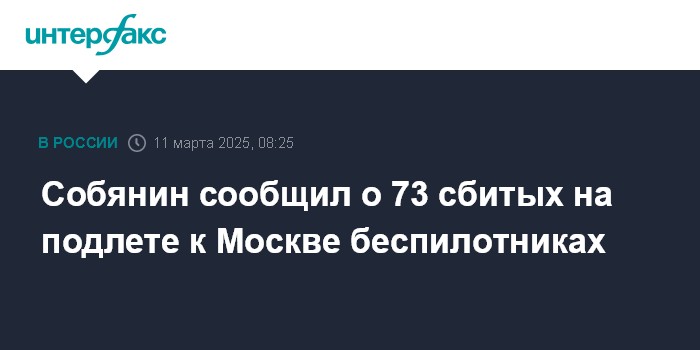 Москва. 11 марта. INTERFAX.RU - Мэр Москвы Сергей Собянин сообщил, что число дронов, сбитых на подлете к Москве, увеличилось до 73.