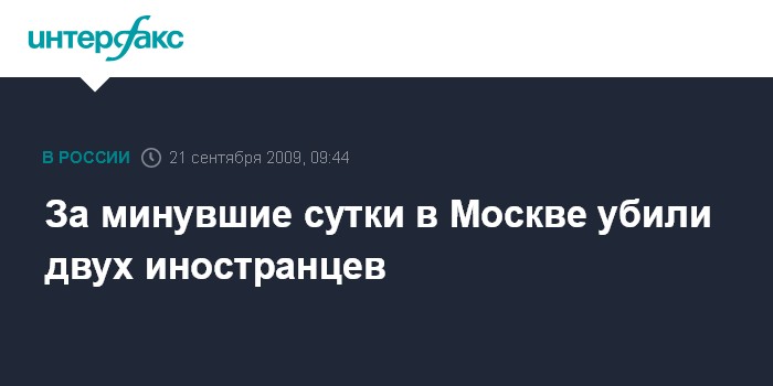 Москва. 21 сентября. INTERFAX.RU - За прошедшие сутки на территории столицы обнаружены трупы гражданина Украины и гражданина Азербайджана, оба с ножевыми ранениями, сообщил "Интерфаксу" источник в правоохранительных органах города в понедельник. "В воскресенье утром на северо-западе Москвы на первом этаже жилого дома на Химкинском бульваре с девятью колото-резаными ранениями живота, груди и рук был обнаружен труп 48-летнего неработающего гражданина Украины. Также в воскресенье вечером в Зеленограде был обнаружен труп 39-летнего уроженца Азербайджана", - рассказал собеседник агентства. Он также отметил, что в обоих случаях возбуждены уголовные дела, проводится расследование.