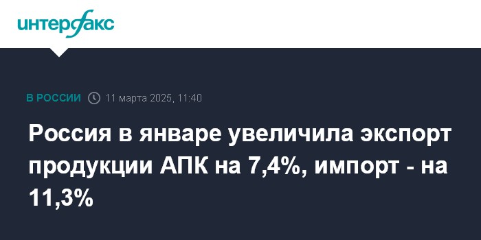 Москва. 11 марта. INTERFAX.RU - Россия в январе 2025 года экспортировала продовольственных товаров и сельскохозяйственного сырья (кроме текстильного) на $3,3 млрд (ланные округлены до десятых), что на 7,4% больше, чем в январе 2024 года ($3 млрд), сообщается в материалах Федеральной таможенной службы.