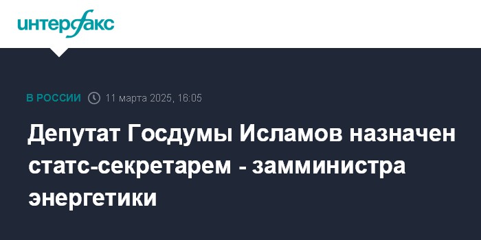 Депутат Госдумы Исламов назначен статс-секретарем - замминистра энергетики