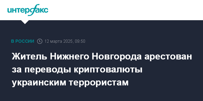 Москва. 12 марта. INTERFAX.RU - ФСБ сообщила о задержании и аресте в Нижнем Новгороде гражданина РФ, вступившего в контакт и переводившего деньги в криптовалюте организации из Украины, признанной в РФ террористической.
