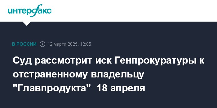 Москва. 12 марта. INTERFAX.RU - Арбитражный суд Москвы назначил на 18 апреля рассмотрение иска Генпрокуратуры к компании Universal Beverage Company, активы которой в России (холдинг "Главпродукт") в октябре 2024 года по указу президента России были переданы во временное управление Росимуществу.