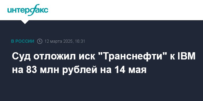 Москва. 12 марта. INTERFAX.RU - Арбитражный суд Москвы отложил на 14 мая рассмотрение иска "Транснефти" к американской IBM на 83 млн рублей, говорится в судебной картотеке.
