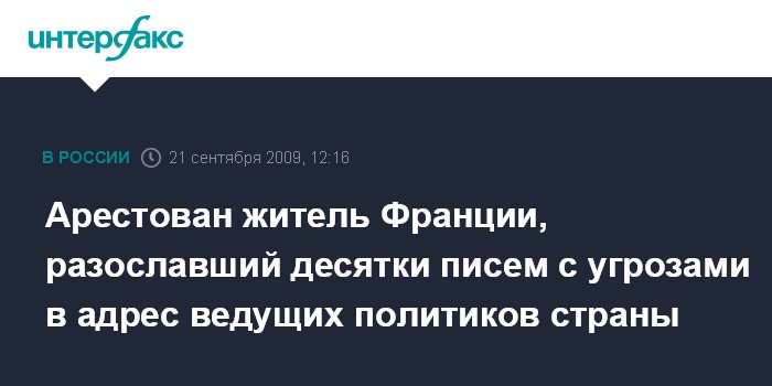 Москва. 21 сентября. INTERFAX.RU - Французская полиция объявила, что ей удалось задержать мужчину, разославшего с конца 2008 года около тридцати писем с угрозами в адрес видных местных политиков. По сообщению радиостанции "Европа-1", подозреваемый, был задержан в воскресенье близ города Монпелье. В понедельник на допросе признал свою вину. Полиция пока не сообщает фамилию этого человека.