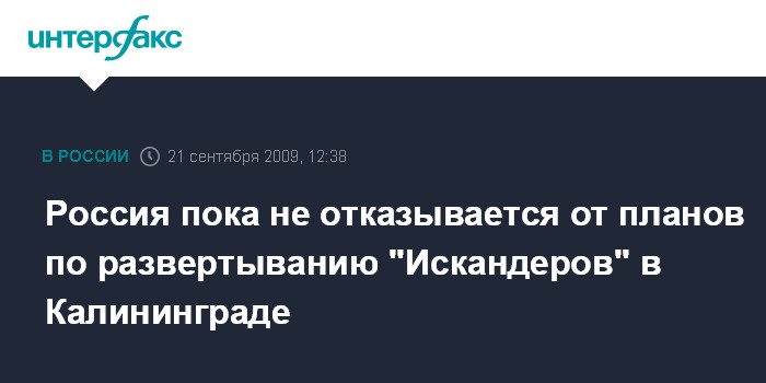 Москва. 21 сентября. INTERFAX.RU - В России пока не принято решения об отказе развертывать комплексы "Искандер" в Калининградской области из-за решения США не размещать объекты ПРО в Европе, сообщил журналистам в понедельник начальник российского Генштаба Николай Макаров. "Решения такого не принято. Это должно быть политическое решение", - сказал он, отвечая на вопрос "Интерфакса".
