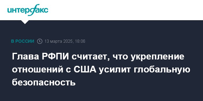 Москва. 13 марта. INTERFAX.RU - Укрепление российско-американских отношений означает большую стабильность и глобальную безопасность, считает глава Российского фонда прямых инвестиций Кирилл Дмитриев Он написал об этом в соцсети Х.