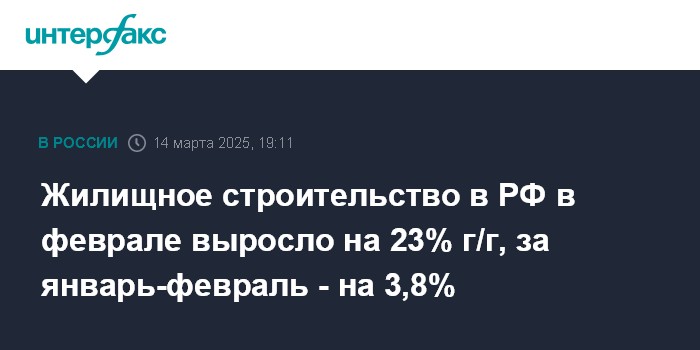 Жилищное строительство в РФ в феврале выросло на 23% г/г, за январь-февраль - на 3,8%
