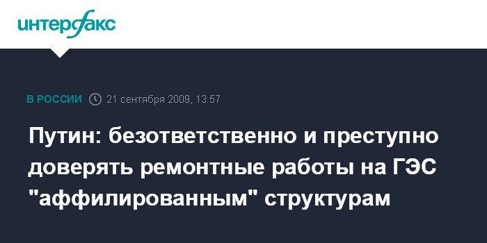 Москва. 21 сентября. INTERFAX.RU - Премьер-министр РФ Владимир Путин считает безответственным экономию денег на обеспечении безопасности гидроэлектростанций. "Безответственно и преступно экономить деньги на безопасности или доверять соответствующие ремонтные работы аффилированным с кем бы то ни было, а особенно с руководством объектов, структурам, как правило, не имеющим достаточно опыта и знаний", - заявил В.Путин на совещании о ходе ликвидации последствий аварии на Саяно-Шушенской ГЭС.