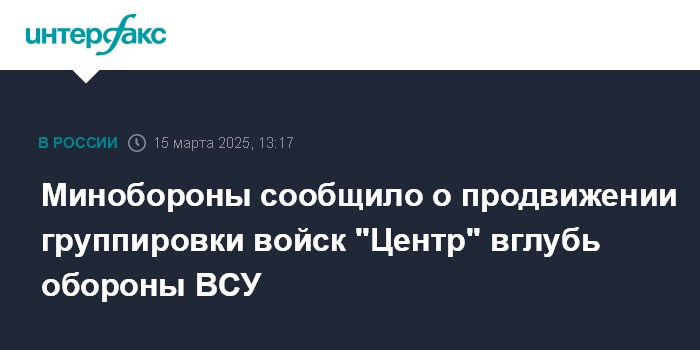 Москва. 15 марта. INTERFAX.RU - Группировка войск "Центр" продвигается в глубину обороны вооруженных сил Украины (ВСУ), заявили в Минобороны РФ в субботу.