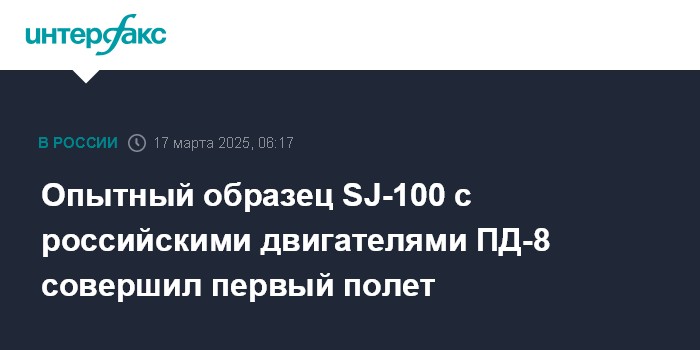 Корабль Crew Dragon с космонавтом "Роскосмоса" на борту сблизился с МКС для стыковкиЧитать подробнееДля первого полета на отечественных двигателях использовался опытный образец SJ-100 с заводским номером 95157, произведенный в 2018 году. Полностью российский борт с двигателями ПД-8 присоединится к сертификационным летным испытаниям в апреле, заявил генеральный директор "Ростеха" Сергей Чемезов, которого цитирует пресс-служба. В правительстве рассчитывают, что работа будет вестись в графике, отметил первый вице-премьер РФ, глава набсовета "Ростеха" Денис Мантуров: государство, по его словам, обеспечивает необходимую финансовую и ресурсную поддержку.