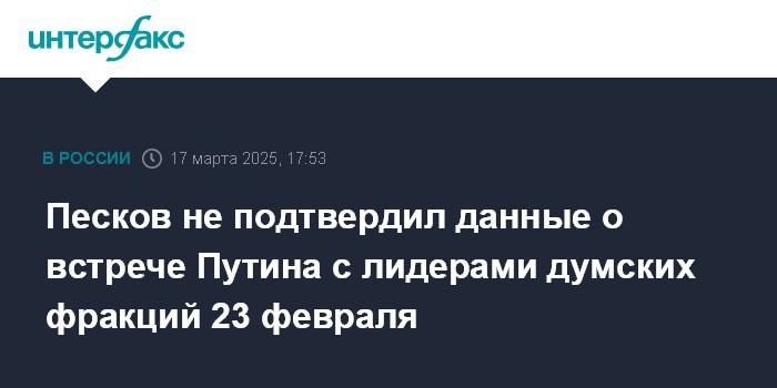 Москва. 17 марта. INTERFAX.RU - Президент Владимир Путин не проводил встречу с лидерами фракций Госдумы 23 февраля, сообщил его пресс-секретарь Дмитрий Песков.