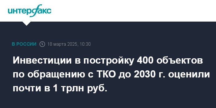 "На будущую пятилетку (до 2030 года), чтобы выполнить национальную цель, необходимо построить ещё 400 объектов (для комплексного обращения с ТКО - ИФ). Чтобы было понимание, сколько это стоит, то это в деньгах сегодняшнего времени почти 1 трлн руб. Источники будут разные - бюджетная поддержка и, конечно, мы рассчитываем на привлечение внебюджетных источников", - сказал Козлов на заседании комитета Госдумы по экологии, природным ресурсам и охране окружающей среды во вторник.