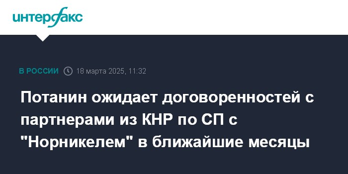 Потанин ожидает договоренностей с партнерами из КНР по СП с "Норникелем" в ближайшие месяцы