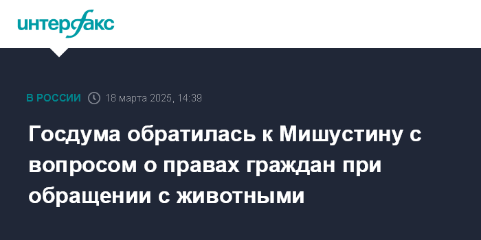 Москва. 18 марта. INTERFAX.RU - Госдума постановила обратиться к председателю правительства Михаилу Мишустину по вопросам, касающимся обеспечения безопасности и соблюдения прав и законных интересов граждан при обращении с животными.