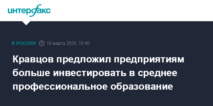Москва. 18 марта. INTERFAX.RU - Министр просвещения Сергей Кравцов, выступая на съезде РСПП, призвал предприятия больше инвестировать в среднее профессиональное образование.