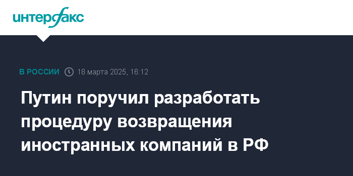 Москва. 18 марта. INTERFAX.RU - Президент РФ Владимир Путин поручил правительству разработать процедуру согласования возвращения в Россию иностранных компаний, ранее покинувших страну, актуализировать их перечень.