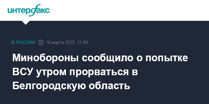 Минобороны сообщило о попытке ВСУ утром прорваться в Белгородскую область