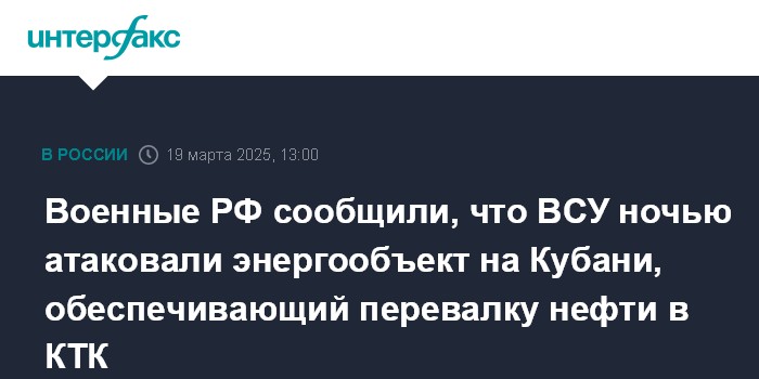 Москва. 19 марта. INTERFAX.RU - Вооружённые силы Украины ночью совершили преднамеренную атаку беспилотниками энергетического объекта в станице Кавказская (Краснодарский край), который обеспечивает перевалку нефти с железнодорожных цистерн в трубопроводную систему международной нефтетранспортной компании Каспийский трубопроводный консорциум (КТК), сообщает министерство обороны РФ.