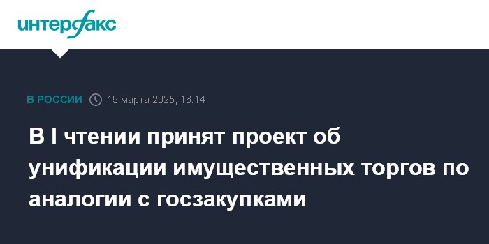 Москва. 19 марта. INTERFAX.RU - Госдума РФ приняла в I чтении законопроект (№819547-8) об унификации имущественных торгов по аналогии с госзакупками.