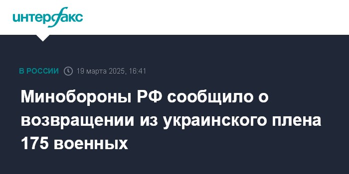 Москва. 19 марта. INTERFAX.RU - Минобороны России сообщает, что из украинского плена возвращены 175 военнослужащих, Киеву передано 175 человек и еще 22 тяжелораненых военнопленных.