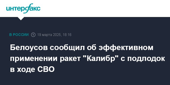 Москва. 19 марта. INTERFAX.RU - Министр обороны России Андрей Белоусов заявил об эффективном применении в ходе специальной военной операции крылатых ракет "Калибр" с борта подводных лодок.