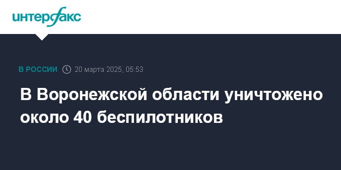 Москва. 20 марта. INTERFAX.RU - В Воронежской области в ночь на четверг было нейтрализовано почти 40 беспилотников, никто не пострадал, сообщил губернатор региона Александр Гусев.