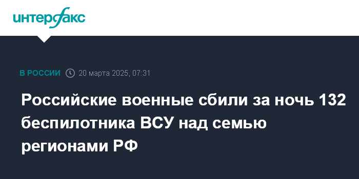 Москва. 20 марта. INTERFAX.RU - Средства ПВО уничтожили в ночь на четверг 132 украинских беспилотника над Саратовской, Воронежской, Белгородской, Ростовской, Курской, Липецкой областями и Республикой Крым, сообщает Минобороны РФ.
