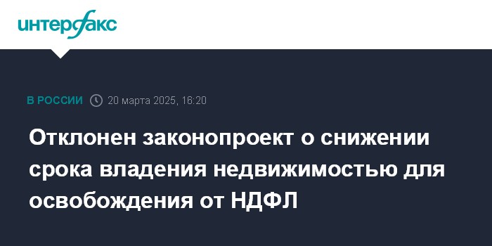 Москва. 20 марта. INTERFAX.RU - Госдума отклонила законопроект об изменении Налогового кодекса в части уменьшения предельного срока нахождения в собственности объекта недвижимости для освобождения от уплаты НДФЛ.