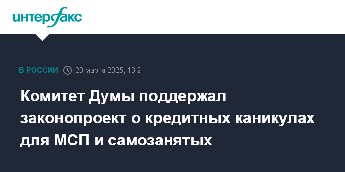 Москва. 20 марта. INTERFAX.RU - Комитет Госдумы по финансовому рынку поддержал депутатский законопроект, который позволяет субъектам МСП, а также самозанятым требовать от банков предоставления кредитных каникул сроком до шести месяцев раз в пять лет, независимо от их финансового положения.