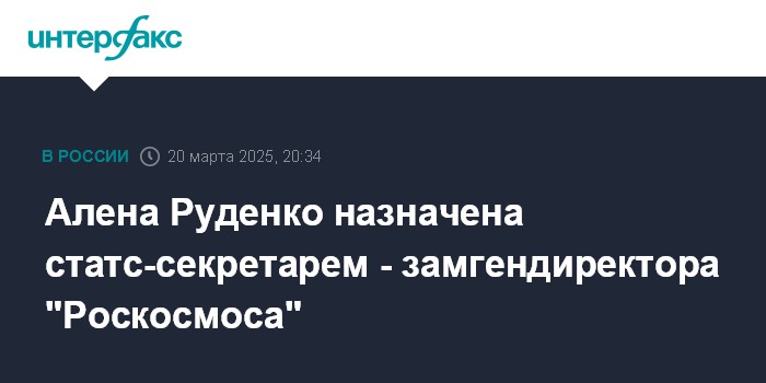 Москва. 20 марта. INTERFAX.RU - Новым статс-секретарем - заместителем гендиректора "Роскосмоса" стала Алена Руденко, ранее она занимала должность статс-секретаря - замминистра Минцифры, сообщили в пресс-службе госкорпорации.