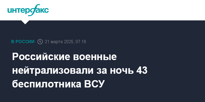 Москва. 21 марта. INTERFAX.RU - В течение прошедшей ночи средства ПВО перехватили и уничтожили 43 украинских беспилотника в Волгоградской, Ростовской, Белгородской и Курской областях, сообщили в Минобороны РФ.