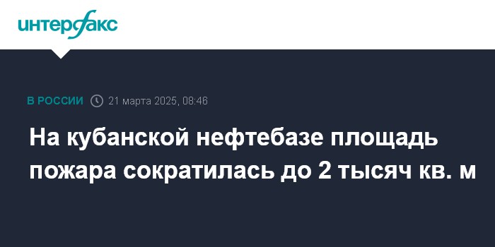 Москва. 21 марта. INTERFAX.RU - На нефтебазе в Кавказском районе Краснодарского края пожарным удалось сократить площадь возгорания с 10 тысяч до 2 тысяч квадратных метро, сообщила пресс-служба Министерства ГО и ЧС Кубани.