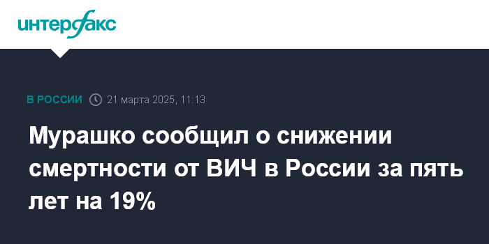 Москва. 21 марта. INTERFAX.RU - В России за последние пять лет показатели смертности населения от ВИЧ-инфекции снизились почти на 20%, сообщил глава Минздрава РФ Михаил Мурашко.
