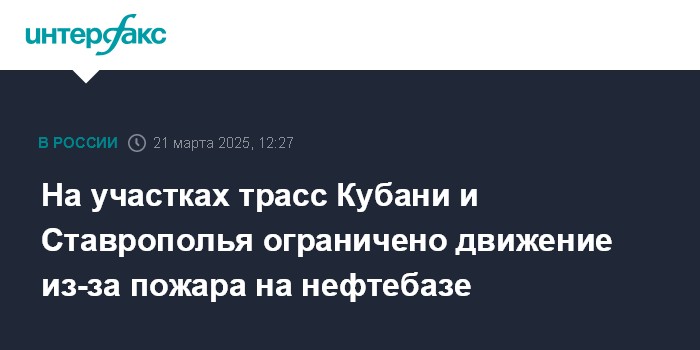Москва. 21 марта. INTERFAX.RU - Движение транспорта ограничено на участке трассы регионального значения Краснодар - Кропоткин - граница Ставропольского края в связи с пожаром на нефтебазе в станице Кавказская, сообщил оперативный штаб Кубанирегиона.