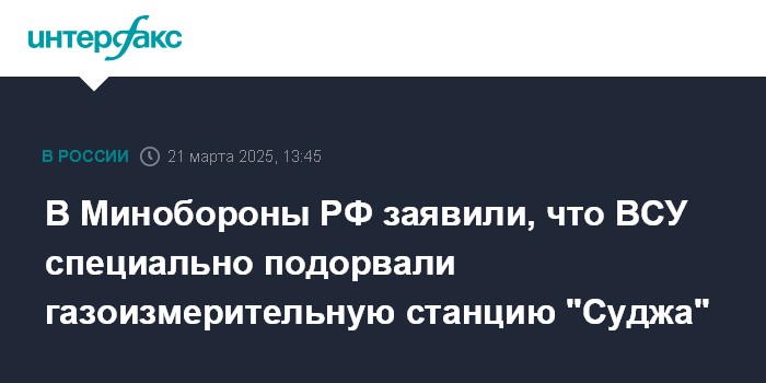 "Ночью 21 марта 2025 года около 00:20 киевским режимом преднамеренно осуществлен подрыв расположенной в нескольких сотнях метров от государственной границы со стороны Курской области газоизмерительной станции "Суджа", - говорится в сообщении военного ведомства.