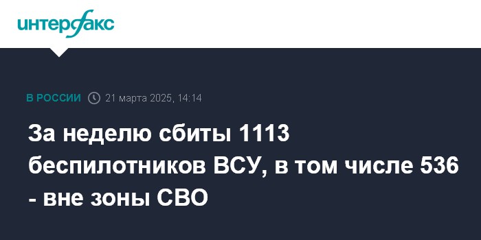 Москва. 21 марта. INTERFAX.RU - Вооружённые силы России за неделю уничтожили 1 113 украинских БПЛА, в том числе 536 - вне зоны специальной военной операции, сообщает министерство обороны РФ.