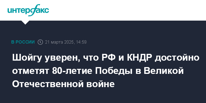 Москва. 21 марта. INTERFAX.RU - Секретарь Совета безопасности (СБ) РФ Сергей Шойгу уверен, что Россия и КНДР достойно отметят 80-летие Победы в Великой Отечественной войне.