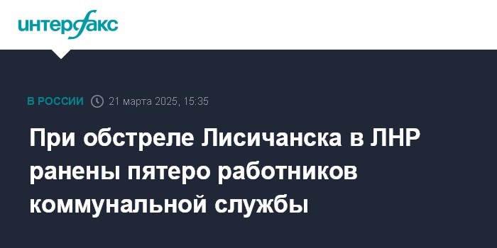 Москва. 21 марта. INTERFAX.RU - Пятеро работников коммунальной службы Лисичанска в Луганской народной республике ранены в результате обстрела города со стороны украинской армии, сообщили в правительстве ЛНР.