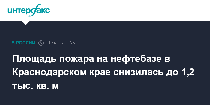 "Загоревшийся 19 марта резервуар на нефтебазе в Кавказском районе полностью потушили. По состоянию на 20:00 мск площадь пожара составляет 1250 кв. м. Специалисты тушат соседний резервуар, который был поврежден и воспламенился в ночь с 20 на 21 марта", - говорится в сообщении.