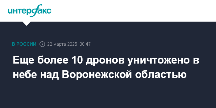 Москва. 22 марта. INTERFAX.RU - Губернатор Воронежской области Александр Гусев сообщил о ликвидации еще свыше 10 беспилотников над регионом.