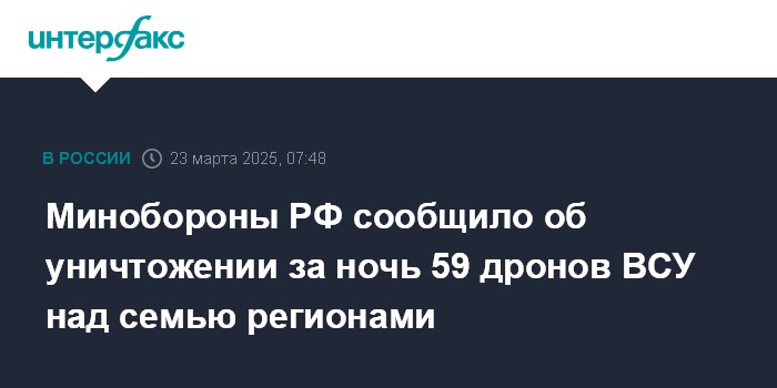 Москва. 23 марта. INTERFAX.RU - В ночь на воскресенье над семью российскими регионами уничтожено 59 украинских беспилотников, большая часть - над Ростовской областью, сообщило Минобороны РФ.