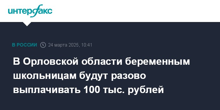 Москва. 24 марта. INTERFAX.RU - Власти Орловской области распространили единовременную выплату в 100 тыс. рублей на школьниц, вставших на учет по беременности.