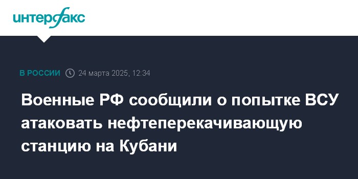 Москва. 24 марта. INTERFAX.RU - Украинская армия минувшей ночью пыталась атаковать нефтеперекачивающую станцию "Кропоткинская" КТК в Краснодарском крае, ударный беспилотник перехвачен в семи километрах от объекта, сообщило в понедельник Минобороны России.