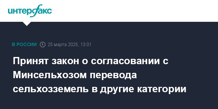 Москва. 25 марта. INTERFAX.RU - Госдума приняла в третьем чтении закон о введении обязательного согласования перевода земель сельскохозяйственного назначения в другие категории с Минсельхозом РФ.