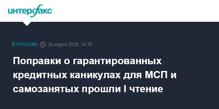 Москва. 25 марта. INTERFAX.RU - Госдума приняла в первом чтении законопроект, который позволяет субъектам малого и среднего предпринимательства, а также самозанятым требовать от банков предоставления кредитных каникул сроком до шести месяцев раз в пять лет, независимо от их финансового положения.