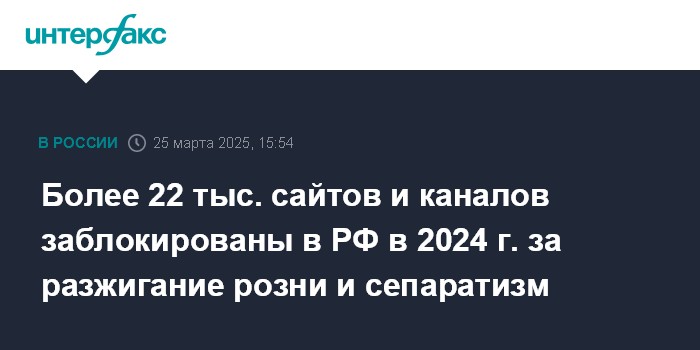Более 22 тыс. сайтов и каналов заблокированы в РФ в 2024 г. за разжигание розни и сепаратизм