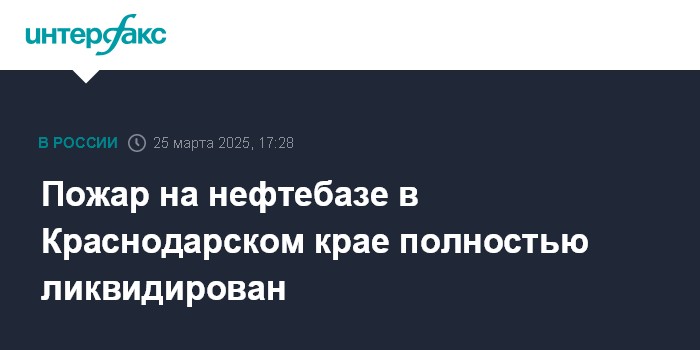 Москва. 25 марта. INTERFAX.RU - Специалистам удалось полностью ликвидировать пожар на нефтебазе в Краснодарском крае после атаки БПЛА на минувшей неделе, сообщил губернатор региона Вениамин Кондратьев в своем телеграм-канале.